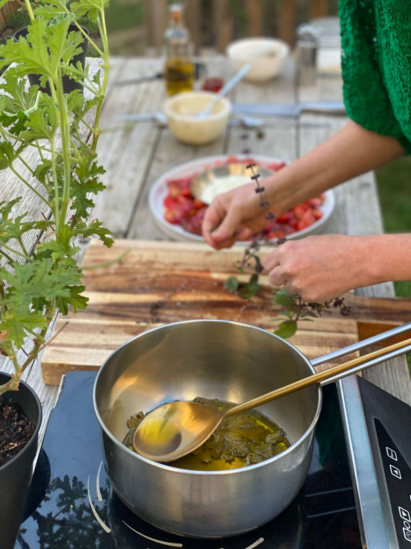 Après une présentation de notre collection de plantes aromatiques rares, l'atelier comprend une initiation de 2 heures à la préparation de 5 produits d'épicerie parmi les suivants :